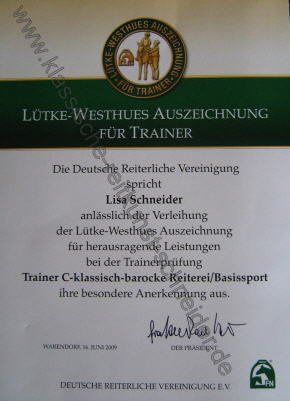Am 16. Juni 2009 wurde ich für herausragende Leistungen bei der Trainerprüfung Trainer C-klassisch-barocke Reiterei/Basissport mit der Lütke-Westheus Auszeichnung der deutschen reiterlichen Vereinigung geehrt.